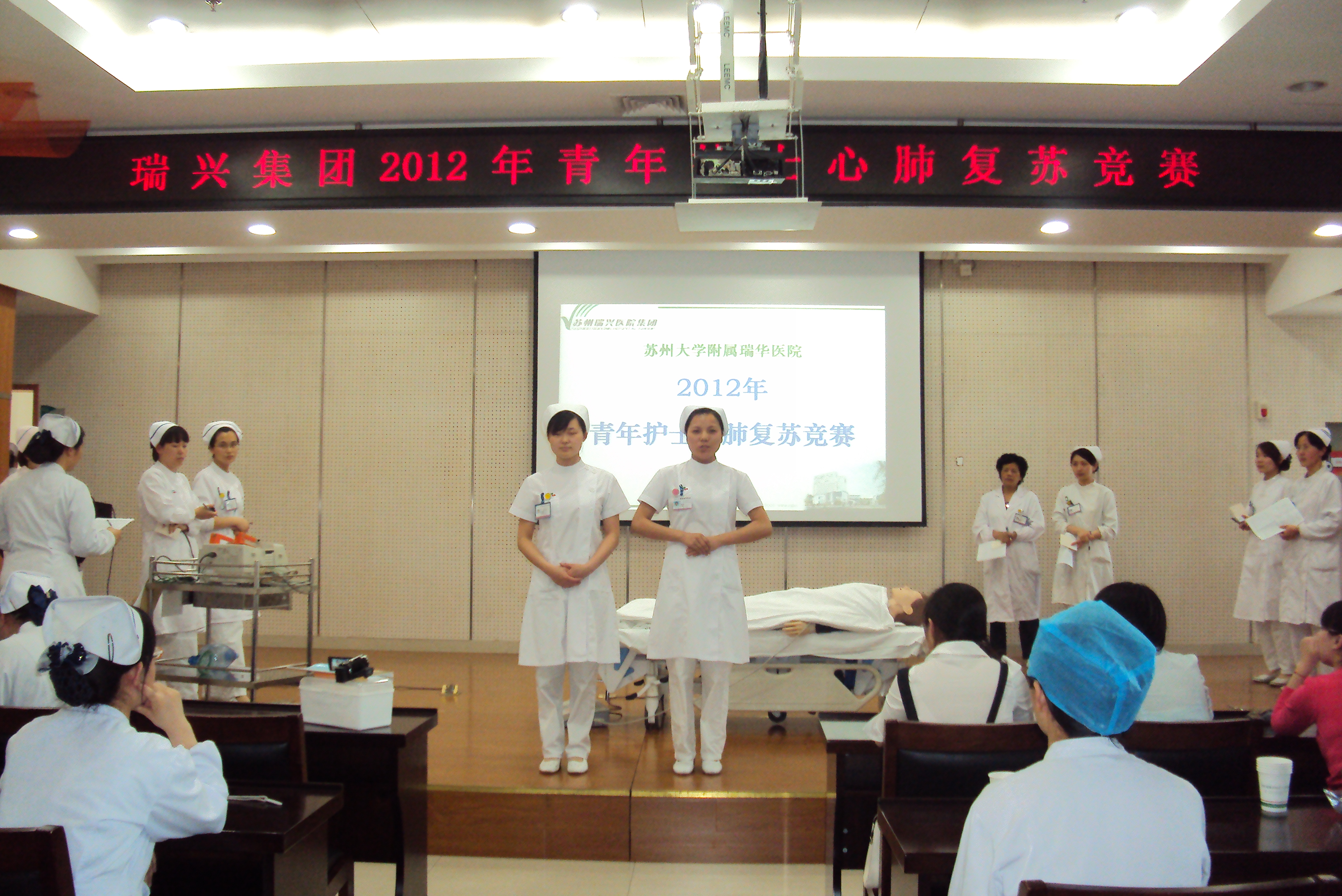 2、为纪念“5·12”国际护士节100周年,迎接5.4青年节及5.12护士节的到来,认真贯彻落实《江苏省年轻护士素质提高行动方案》文件精神,进一步提高我院青年护士急救技能操作水平,保障护理安全及急诊急救质量,5月4日护理部举办瑞兴集团年轻护士双人心肺复苏技能大赛活动,通过各护理单元预赛,选出14组进入5月4日的竞赛,经过各组选手的努力拼搏,最后评出一等奖:李玲、王倩(急诊科)、二等奖:孙娣、奚娜娜(十病区)、丁娇、徐婷(康复科)三等奖:田然、侯幸(ICU)、孙红利、朱红(十一区)、刘芳、刘利侠(九病区),通过本次青年护士心肺复苏的训练考核,使瑞兴集团的青年护士掌握2010版双人心肺复苏技能,及护理救治技能综合素质的提高有积极的意义。