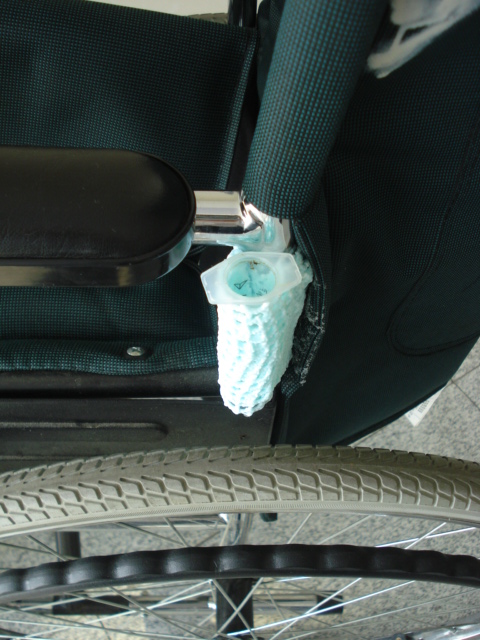 举轮椅的人身高矮了还不行,在行走过程中还需要保持速度一致,不然容易拉脱输液针。为了解决以上问题,我在轮椅上