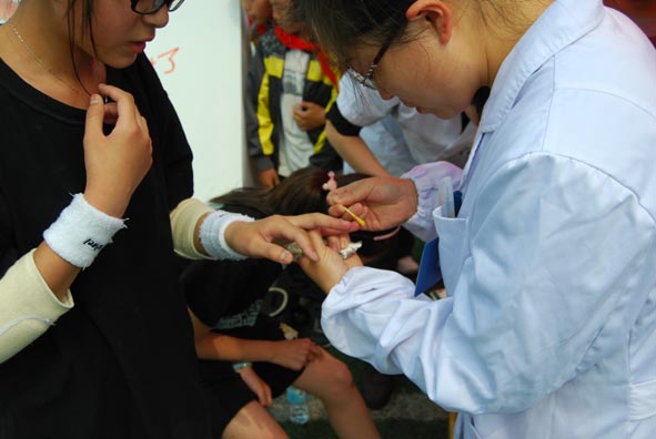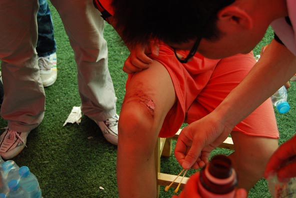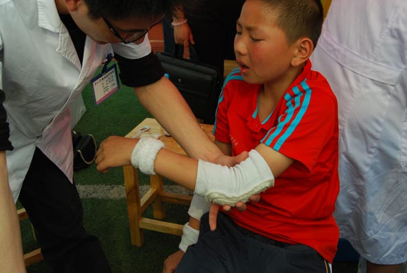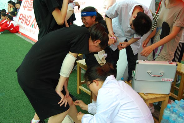 “红星闪闪校园行”,2011年5月12日第四届伙伴计划正式鸣锣开赛,14支队伍相城火热开跑。顶着烈日和伤痛,小伙伴们积极的投入到赛事中去。比赛过程中,有的小伙伴胳膊、腿擦伤了、有的小伙伴骨折了,现场医生进行了紧急救护、包扎。在救治完当天受伤的小伙伴之后,当天救护工作圆满完成。在伙伴计划比赛中,苏州大学附属瑞华医院作为全程医疗支持单位,派出的救助队伍受到了各单位、师生的广泛好评,我们的白衣天使用自己的行动树立了医院的良好形象。