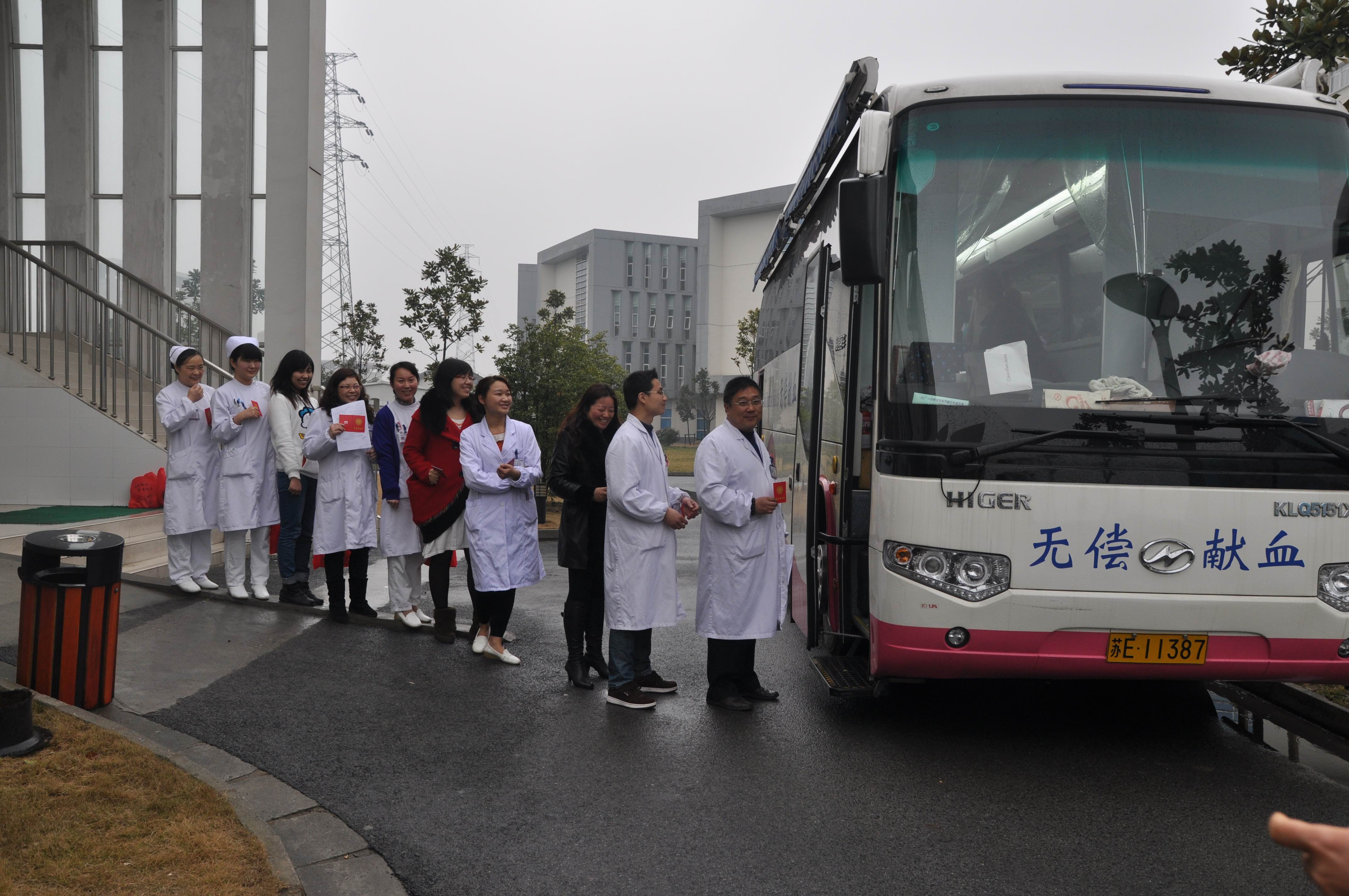 (大家排队上车献血)