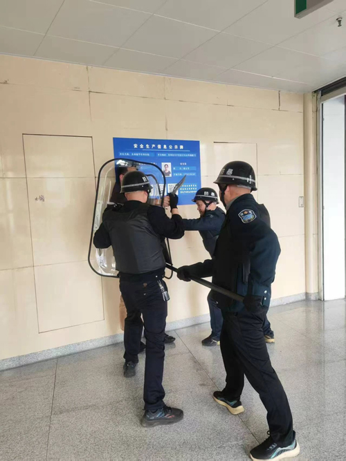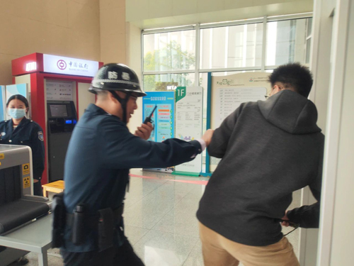 演练模拟了一名陌生人员携带可疑物品试图过安检,安保人员在劝阻过程中,陌生人员情绪激动,使用刀具企图强行进入医院的场景。值班队长立即按下一键报警装置,其他安保人员迅速启动应急预案,与“暴徒”进行周旋,尽量稳定其情绪,避免其做出过激行为。与此同时,其他医护人员迅速组织患者及家属疏散到安全区域,设置警戒区域,防止无关人员进入危险地带。