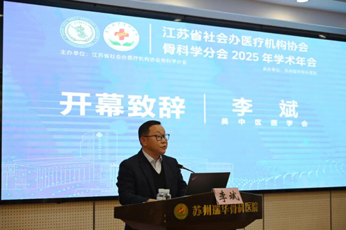 苏州市吴中区医学会秘书长李斌在致辞中充分肯定了苏州瑞华骨科医院近年来在学科建设、人才培养、学术交流等方面取得的积极成效。他希望通过本次年会的平台,共享新知,碰撞思想,共同推动吴中区骨科事业向更高水平迈进。