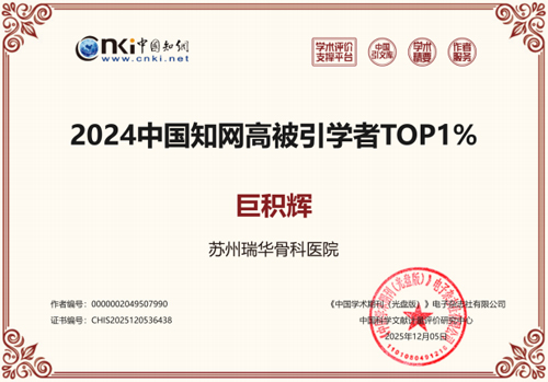 巨积辉副院长凭借卓越的学术成果与行业影响力,入选2024中国知网高被引学者TOP1% 榜单。中国知网高被引学者榜单以客观的引文数据为核心,是衡量学者学术贡献与行业认可度的重要标尺,这一荣誉不仅是对巨积辉副院长个人学术能力的肯定,更是我院在骨科领域科研实力的有力证明。